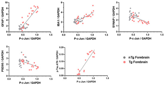 Correlation of p-c-Jun with neuronal injury markers and synaptic markers in rTg4510 mouse brain. Correlation plots between the amount of GFAP/GAPDH (R2 = 0.78), IBA1/GAPDH (R2 = 0.63), SYNAP/GAPDH (R2 = 0.46), PSD-95/GAPDH (R2 = 0.28), and p-TAU AT8/GAPDH (R2 = 0.83) with p-c-Jun/GAPDH in forebrain of nTg and Tg mice. Grey circles, nTg; pink circles, Tg; p < 0.0001, Pearson correlation.