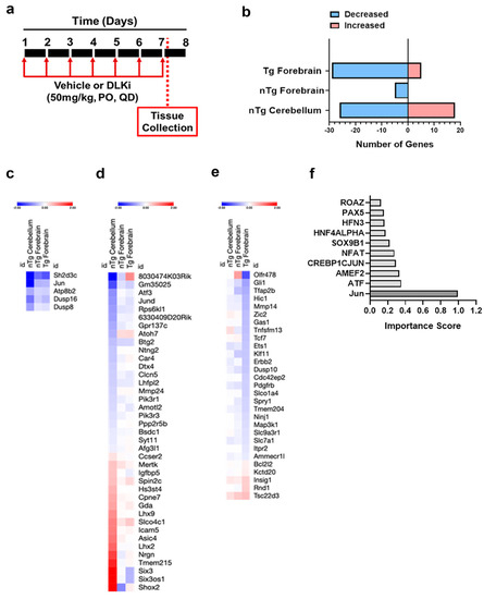 Since DLK signals through activation of transcription factors [50] we reasoned that changes in mRNA levels would identify differences in signaling output. We performed RNA-Seq on nTg forebrain, Tg forebrain, and nTg cerebellum of mice post continuous inhibition with 50 mg/kg DLKi or vehicle QD for seven days (Figure 7a). This dosing paradigm was chosen to allow for maximal effect on target mRNAs while minimizing potential large-scale changes in cell composition that could obscure the analysis. ANOVA and post-hoc tests accounting for brain region, genotype, and treatment identified significant (padj < 0.05) differentially expressed genes in the DLKi treatment groups (Figure 7b). In the nTg forebrain, only five genes were significantly affected by DLKi (Figure 7c); these were also altered similarly in Tg forebrain and nTg cerebellum and thus comprise a core set of DLK-dependent transcripts across brain regions and contexts. In contrast to this minimal response, the Tg forebrain exhibited 34 significant gene expression changes (Figure 7e), whereas 44 genes were differentially expressed in the nTg cerebellum (Figure 7d) for a total of 78 genes. The combined list of 78 genes were subjected to unsupervised clustering. Strikingly, other than the five core DLK responsive genes, all other responsive transcripts showed region-specific regulation and were significant only in the nTg cerebellum or Tg forebrain, but not both (Figure 7c–e). This entire list of 78 genes was submitted to regulatory element analysis to identify putative transcription factors mediating the response to DLKi, and Jun binding sites were the most significantly enriched, suggesting that p-c-Jun is the primary means by which DLK regulates transcription (Figure 7f).