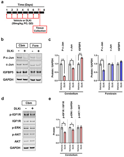 The predominant function of IGFBP5 is to limit the bioavailability of IGF1 and modulate its interaction with IGF1R. Binding of IGF1 to its receptor leads to phosphorylation of IGF1R, which further leads to phosphorylation and recruitment of the insulin receptor substrate-1 (IRS-1) and PI3K, consequently resulting in activation of downstream signaling components like AKT and MAPK pathways. Therefore, we analyzed cerebellar lysates from WT mice treated with 50 mg/kg of DLKi or vehicle QD for seven days for IGF1 signaling axis components. Phosphorylated-IGF1R (p-IGF1R) levels in the cerebellum were decreased by DLKi (p < 0.05) with no effect on total IGF1R (Figure 8d,e). Furthermore, DLKi decreased p-ERK (p < 0.05) but had no effect on p-AKT at the time points measured.