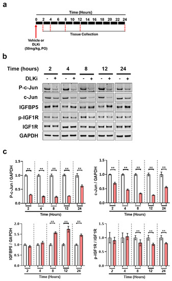 To further understand the kinetics between DLK inhibition and upregulation of cerebellar IGFBP5, we performed Western blot analysis on cerebellar homogenates from adult male WT mice dosed with a single dose of 50 mg/kg of DLKi or vehicle and sacrificed at either 2, 4, 8, 12 or 24 h post dose (Figure 9a). DLKi decreased p-c-Jun levels by 2 h post administration, which was sustained for 24 h (Figure 9b,c). Western blot analysis showed that DLKi upregulated IGFBP5 (p < 0.01) 8 h post treatment, which was sustained through 24 h. This DLKi-induced IGFBP5 upregulation in the cerebellum was accompanied by a significant reduction of p-IGF1R. These data suggest that one function of constitutively active DLK in the adult brain is to promote IGF1 signaling in the cerebellum.