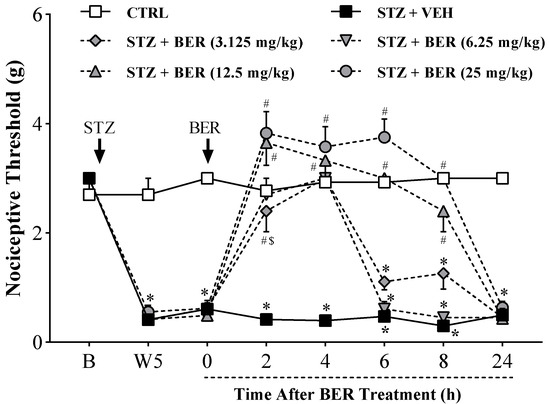Acute effect of bergenin on diabetic sensory neuropathy. Diabetic mice were intraperitoneally treated with bergenin (BER; 3.125–25 mg/kg) or vehicle (2% dimethyl sulfoxide in saline; VEH). Non-diabetic control group (CTRL) received citrate buffer only. The nociceptive threshold (axis of ordinates) was evaluated prior to the experiment (baseline; B), at the fifth week after streptozotocin (STZ) before treatments (W5), and at different times after bergenin treatment. Values represent the filament weight (g) in which mice responded in 50% of the presentations. Data are expressed as means ± SD (n = 6). Two-way ANOVA with repeated measures showed significant difference regarding the time of observation (p < 0.05) and treatments (p < 0.05), and a significant treatment-time interaction (p < 0.05). Bonferroni’s multiple comparisons: * p < 0.05 compared with CTRL group. # p < 0.05 compared with STZ + VEH group. $ p < 0.05 compared with STZ + BER (12.5 mg/kg) and STZ + BER (25 mg/kg) groups.