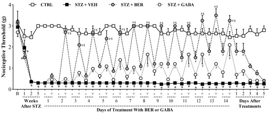 Effect of multiple doses of bergenin on diabetic sensory neuropathy. Diabetic mice were treated with bergenin (BER; 25 mg/kg, i.p.), vehicle (2% dimethyl sulfoxide in saline; VEH, i.p.), or gabapentin (GABA; gold standard drug, 40 mg/kg, p.o.) twice a day for 14 days, starting in the fifth week after STZ. Non-diabetic control group (CTRL) received citrate buffer only. The nociceptive threshold (axis of ordinates) was evaluated prior to the experiment (baseline; B), weekly until the fifth week after STZ, and daily from the beginning of treatments until the last experimental day. During the 14 days of treatment, thresholds were daily assessed in two moments: Immediately before (−) and one hour after (+) the first dose of the day. Values represent the filament weight (g) in which mice responded in 50% of the presentations. Data are expressed as means ± SD (n = 6). Two-way ANOVA with repeated measures showed significant difference regarding the time of observation (p < 0.05) and treatments (p < 0.05), and a significant treatment-time interaction (p < 0.05). Bonferroni’s multiple comparisons: * p < 0.05 compared with CTRL group. # p < 0.05 compared with STZ + VEH group. $ p < 0.05 compared with STZ + GABA group.