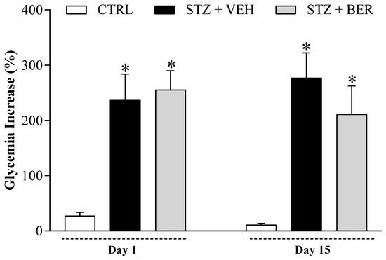 Influence of daily treatment with bergenin on STZ-induced hyperglycemia. Diabetic mice were treated with bergenin (BER; 25 mg/kg, i.p.) or vehicle (2% dimethyl sulfoxide in saline; VEH, i.p.) twice a day for 14 days, starting in the fifth week after STZ. The non-diabetic control group (CTRL) received citrate buffer only. Glycemia levels were assessed prior to the experiment (baseline), after STZ induction and immediately before daily treatments (day 1), and after two weeks of daily treatments (day 15). Glycemia increase (axis of ordinates) was calculated as the percentage rise in blood glucose levels relative to baseline. Data are expressed as means ± SD (n = 6). * p < 0.05 compared with CTRL group. One-way ANOVA followed by Tukey’s test.