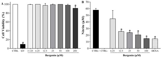 Influence of bergenin on the cell viability and NO production by J774 macrophages. (A) Cell viability was determined by the Alamar Blue assay in J774 macrophages incubated for 72 h with bergenin (BER; 3.125–200 μΜ), vehicle (2% dimethyl sulfoxide in saline; CTRL), or gentian violet (GV; 10 μM, positive control). Data are expressed as means ± SD of 3 replicates. * p < 0.05 compared with CTRL group. One-way ANOVA followed by Tukey’s test. (B) Concentrations of nitrite were determined by the Griess method in J774 macrophages incubated for 24 h with bergenin (BER; 6.25–100 μΜ), vehicle (2% dimethyl sulfoxide in saline; CTRL+), or dexamethasone (DEXA; reference drug, 40 μM) in the presence of LPS (500 ng/mL) and IFN-γ (5 ng/mL). Unstimulated cells were used as negative control (CTRL-). Data are expressed as means ± SD of 3 replicates. * p < 0.05 compared with CTRL+ group. One-way ANOVA followed by Tukey’s test.