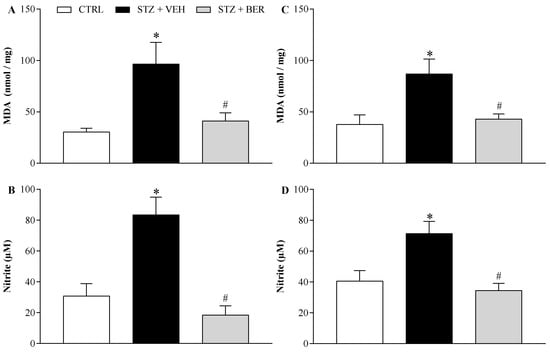 The effects of bergenin (25 mg/kg, twice a day for 14 days) on lipid peroxidation and nitrosative stress during DN were assessed by measuring the tissue levels of MDA and nitrite, respectively (Figure 6). Painful DN was associated with increased levels of MDA and nitrite in the sciatic nerve (Figure 6A,B; p < 0.05) and in the spinal cord (Figure 6C,D; p < 0.05). Bergenin treatment effectively reduced (p < 0.05) the levels of both biomarkers in both peripheral and central nervous tissues.