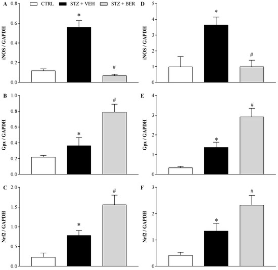 After confirming that bergenin could modulate oxidative stress in the nervous system during chronic diabetic neuropathy, the next protocol was designed to investigate whether this action was due to the activation of neuroprotective antioxidant pathways. STZ-induced painful DN resulted in increased (p < 0.05) mRNA inducible nitric oxide synthase (iNOS) levels in the dorsal root ganglia (DRG; Figure 7A) and spinal cord (Figure 7D). Those levels were drastically reduced by bergenin in both tissues (p < 0.05). On the other hand, neuropathic mice showed increased (p < 0.05) glutathione peroxidase (Gpx; Figure 7B,E) and Nrf2 (Figure 7C,F) mRNA levels in the DRG and in the spinal cord. Daily treatment with bergenin further increased (p < 0.05) the mRNA levels of the antioxidant genes, Gpx and Nrf2, both in DRG and in the spinal cord of mice with painful DN.