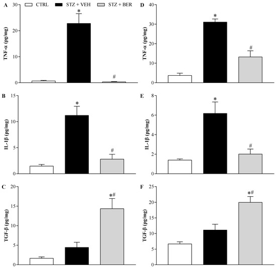 Influence of bergenin on the levels of pro- and anti-inflammatory cytokines in the nervous system of mice with painful diabetic neuropathy. Diabetic mice were intraperitoneally treated with bergenin (BER; 25 mg/kg) or vehicle (2% dimethyl sulfoxide in saline; VEH) twice a day for 14 days. Non-diabetic control group (CTRL) received citrate buffer only. The cytokines tumor necrosis factor-α (TNF-α), interleukin-1β (IL-1β), and transforming growth factor-β (TGF-β) were quantified in the sciatic nerve (A, B, and C, respectively) and spinal cord (D, E, and F, respectively) of mice 24h after the last daily treatment. The results are expressed as picograms of cytokine per milligram of protein. Data are expressed as means ± SD of 3 replicates. * p < 0.05 compared with CTRL group. # p < 0.05 compared with STZ + VEH group. One-way ANOVA followed by Tukey’s test.