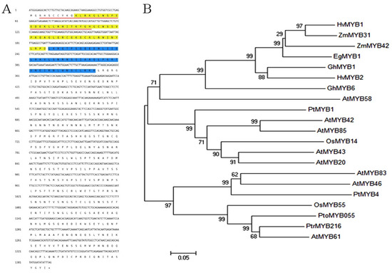Characterization of the PtoMYB055 protein. (A) Amino acid sequence of the coding region of PtoMYB055. The nuclear localization signal is underlined with red line. The R2 MYB domain is highlighted with yellow and the R3 MYB domain was highlighted with blue. (B) The phylogenetic relationship between PtoMYB055 and other MYB transcription factors associated with the secondary cell wall was constructed with the neighbor-joining method in MEGA (version 5.1) [35]. Bootstrap values are shown as percentages at the nodes. The GenBank accession numbers of sequences used are given in Section 4.