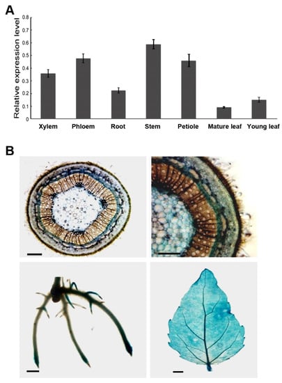 Total RNA was extracted from roots, stems, young leaves, mature leaves, phloem, xylem, and petioles of poplar plants with TRIzol reagent. Then, genomic DNA was removed from the total RNA, and cDNA was synthesized with a PrimeScript™ RT Reagent Kit with gDNA Eraser (Takara, Dalian, China). We performed RT-qPCR with a TP700 Real-Time PCR Machine (Takara, Dalian, China) using the SYBR Green PCR Master Mix Kit (Takara, Dalian, China) following the manual’s recommendations. The housekeeping 18S gene was used as a reference gene. Gene-specific primers used in RT-qPCR assays are listed in Table S1.