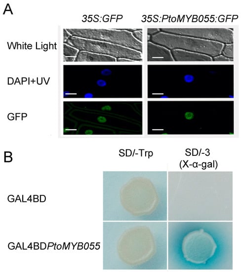 The CDS of PtoMYB055 was cloned into pGBKT7 (Clontech, Mountain View, CA, USA) and introduced into the yeast strain Saccharomyces cerevisiae Gold2 as described previously [45]. Transformants were grown on SD medium lacking tryptophan for the selection of a positive clone and then on SD medium lacking tryptophan, histidine, and adenine for the transactivation assay. X-a-gal was used to identify the transcriptional activation activity of PtoMYB055.