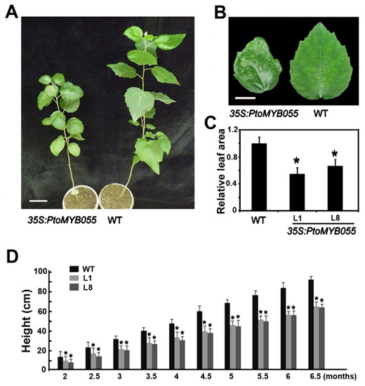 Phenotypes of transgenic poplar plants overexpressing PtoMYB055. (A) Growth in the 35S-PtoMYB055-overexpressing poplar and the wild type. Scale bar = 10 cm. (B) Leaf morphology of the 35S-PtoMYB055-overexpressing poplar and the wild type. Scale bar = 5 cm. (C) Relative leaf area of 35S-PtoMYB055 and the wild type. * p < 0.05 (t test). (D) Heights of 35S-PtoMYB055-overexpressing poplar and the wild type over time. * p < 0.05 (t test).