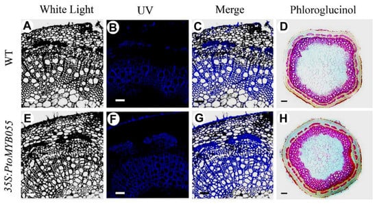 Ectopic deposition of lignin in PtoMYB055-overexpressing poplar. (A–C,E–G) Laser scanning confocal microscopy of stem sections at the fifth internode in PtoMYB055-overexpressing transgenic poplar. (D,H) Stem sections at the fifth internode were stained by phloroglucinol-HCl. Scale bars = 50 µm (A–C,E–G), 500 µm (D,H).