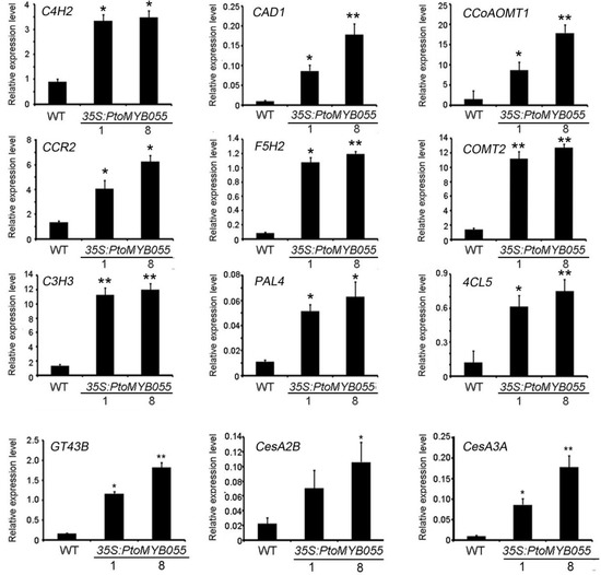 Gene expression analyses of secondary cell wall biosynthetic genes in 35S-PtoMYB055 poplar plants. Transcriptional expression of genes involved in lignin biosynthesis (C4H4, CAD1, CCoAOMT1, CCR2, F5H2, COMT2, C3H3, PAL4, 4CL5), xylan (GT43B), and cellulose (CesA2B, CesA3A) was upregulated. The poplar Actin gene was used as an internal control. Error bars represent ± SD of three biological replicates. * p < 0.05. ** p < 0.01.