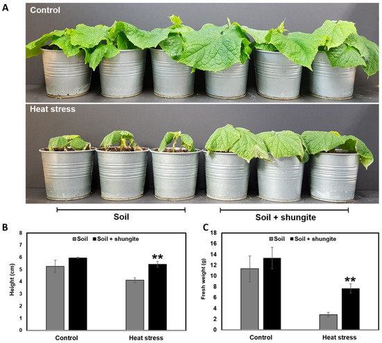 Effects of shungite on heat tolerance in cucumber. (A): Less drooping in leaves of plants exposed to shungite. Representative plants that underwent the two-step heat treatment; (B): Comparison of plant heights; (C): Comparison of fresh weight. Error bars represent mean ± standard deviation (SD), (n = 10). Asterisks indicate statistical significance (Student’s t-test, ** p ≤ 0.05).