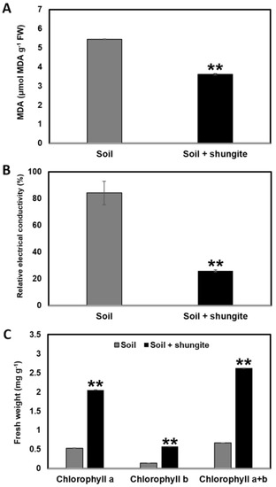 Under a heat stress environment, plants not only showed growth inhibition, but in severe cases, the chloroplasts were destroyed, leading to plant death. Furthermore, plants underwent dehydration to reduce their biomass [53,54]. One of the main causes of this phenomenon is the creation of ROS. ROS are mainly produced in the mitochondria, chloroplasts, and peroxisomes as the by-products of various metabolic pathways. ROS are short-lived, but as strong oxidants, they can have a fatal effect on the regulation of the physiological activity of intracellular DNA and protein. Therefore, their effect on growth was assessed using visual observation, fresh weight, chlorophyll content, and MDA measurement. MDA accumulation is widely used as a marker of oxidative stress in animals and plants [55,56]. We found that the MDA levels of the plants in the shungite group were 37% lower than that in the control group (Figure 2A). Further assays were employed to compare between the groups. The extent of leaf cell damage was assessed by measuring the EC levels and total chlorophyll content. We found that the shungite-treated plants had a less affected phenotype when exposed to heat stress (Figure 2B,C).