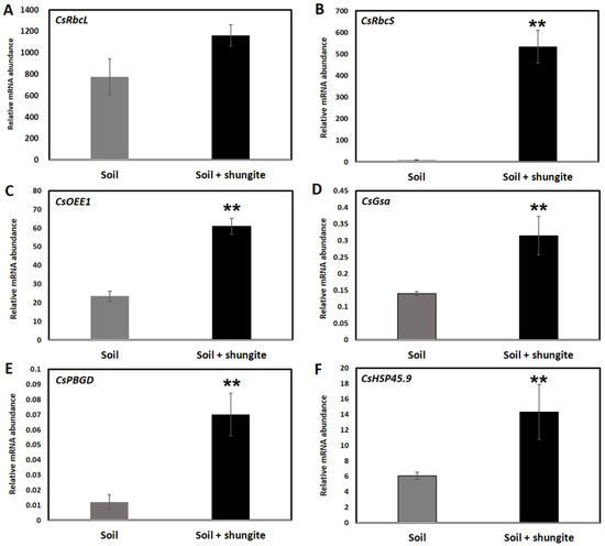 As both temperature and shungite induce significant changes in membrane peroxidation (Figure 1 and Figure 2), we analyzed the transcripts of genes involved in cellular defense and stress response. Many photosynthesis and photosynthetic pigment metabolism progress-related proteins were altered by shungite treatment. To verify these results, we analyzed the expression pattern of three photosynthesis-related genes (rubisco large subunit (CsRbcL), rubisco small subunit (CsRbcS), and oxygen-evolving enhancer protein 1 (CsOEE1)), two photosynthetic pigment metabolism-related genes (glutamate-1-semialdehyde 2,1-aminomuase (CsGsa) and porphobilinogen deaminase (CsPBGD)) [43] and one gene involved in protein protection (heat shock protein 45.9 (CsHSP45.9)), shown in Figure 3A–F. The transcript levels of these genes were largely influenced by the shungite and temperature treatments. In the shungite-treated cucumber plants, CsRbcL, CsRbcS, CsOEE1, CsGsa, CsPBGD, and CsHSP45.9 transcripts were dramatically upregulated by 1.5-, 55.0-, 2.3-, 7.0-, 2.9-, and 2.3-fold, respectively (Figure 3). The primers used for real-time PCR are listed in Supplementary Table S1.