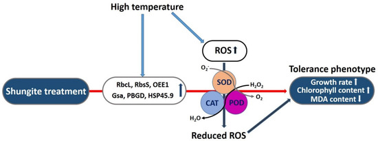 Schematic diagram of shungite-mediated tolerance under heat stress in cucumber. Red solid arrows show plants directly influenced by shungite. Heat stress causes the development of ROS and various types of cell and organ damage, including the degradation of membrane, DNA, and protein. The addition of shungite to soil activates genes related to photosynthesis and the defense response, increases ROS scavenger activity, and reduces cellular or organ damage. This leads to higher growth rates and chlorophyll content.