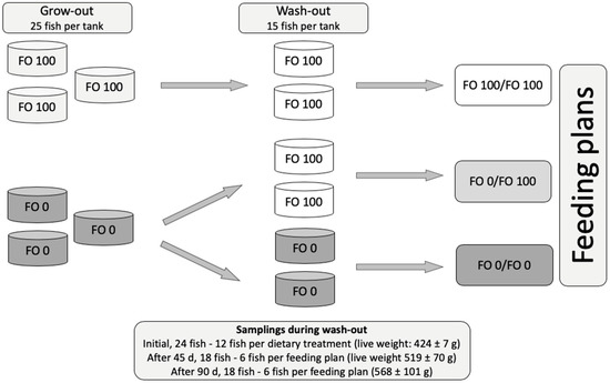 Yellowtails of both sexes, 11 months of age, used in this trial underwent a grow-out period in which they were fed FO 100, FO 25 (75% vegetal oil) and FO 0 diets (three tanks/treatment; 25 fish/tank) for 109 d [58]. Then, the fish that were fed FO 0 and FO 100 diets were moved into 6 tanks and were fed FO 0 diets as the grow-out or FO 100 diets for the next 90 d (wash-out period), as per the following feeding plans: FO 0/FO 0, FO 0/FO 100, and FO 100/FO 100 (2 tanks per experimental group; 15 fish per tank) (Figure 1). Fish that were previously fed FO 25 diet were not considered for the present study.