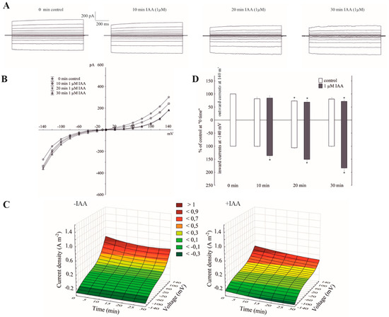 The amplitudes of the instantaneous vacuolar currents in the presence of cytosolic IAA and a ten-fold vacuole-to-cytosol KCl gradient. (A), An example of a whole-vacuole FV current recording in a 10/100 KCl gradient in the absence and presence of 1 µM IAA. The control at “0 time” (0 min control) means the whole-vacuole FV current was recorded immediately after establishing the whole-vacuole configuration in the ten-fold KCl gradient that was imposed on a vacuolar membrane; however, the current in the absence and presence of IAA was recorded 5, 10, 15, 20, 25 and 30 min later. For clarity, only the FV currents in the control (0 min control) and the presence of IAA after 10, 20 and 30 min were shown. (B), The instantaneous vacuolar currents shown as a function of voltage (the data are from the same experiment as shown in A). (C), The current–voltage relationships in the absence (−IAA) and presence (+IAA) of 1 µM IAA shown as a function of time. Means of at least seven different vacuoles are shown. (D), The whole-vacuole FV currents recorded at −140 and +140 mV in the presence of 1 µM IAA. The data were expressed as % of the control (0 min control). Means ± SE of at least six different vacuoles are shown. The normal distribution was evaluated by the Shapiro–Wilk test (p > 0.05). The statistical differences between the control at 0 min and other variants at the same voltage were analyzed using a paired t-test (p < 0.05). Asterisk (*) indicates significant difference.