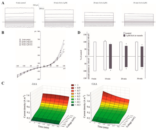 When the whole-vacuole FV currents were recorded in symmetrical 100 mM KCl and in the presence of vacuolar auxin (luminal IAA at 1 µM), the FV currents decreased in a voltage- and time-dependent manner (Figure 3A–C). Luminal auxin diminished both the outward and inward current by about 25% compared to the control over 30 min at ±140 mV (Figure 3D). By comparing the current–voltage relationships shown as a function of time in symmetrical 100 mM KCl (Figure 1C) with ones at vacuolar auxin (Figure 3C), it should be stated that the control (0 min control) in the first case (cytosolic auxin) was lower than in the second case (vacuolar auxin), respectively.