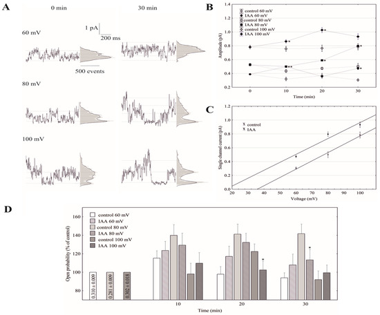 Effect of auxin on the single-channel activity in red beet taproot vacuoles. (A), The representative single-channel activity of the outside-out patch in symmetrical 100 mM KCl and in the absence (−IAA) and presence (+IAA) of auxin at 1 µM is shown. The current traces after 30 min are shown at the different membrane voltages that are indicated as adjacent to the traces. The dotted lines indicate the closing state and different opening ones. In this patch, there are at least three channels opening. The corresponding amplitude histograms are shown to the right of the current traces. (B), The current–voltage relationships of the FV single-channel current amplitudes that were obtained with and without auxin as a function of time. The values of the current were obtained as the differences of the maximum of the current histograms, and represent the open and closed states of a channel, respectively. The data points are the means (±SE) from at least six independent experiments. The data failed normal distribution (Shapiro–Wilk test, p > 0.05) hence, statistical differences between IAA and the control in the same time and voltage were tested using the non-parametric Mann–Whitney U-test (asymptotic significance two-tailed, p < 0.05). Asterisk (*) indicates a significant difference. (C), The current–voltage characteristics for single FV channels in the control bath and in the presence of IAA. Points were obtained from the experiments shown at 30 min in (B). As can be seen, IAA did not change the slope of simple linear regression, expressing the single channel conductivity. (D), The open probability of the FV single channels (expressed as % of control) is shown as a function of voltage and time. The open probability was calculated (using FitMaster software, see also [26]) as the sum of the channel open times in the current traces normalized to the total time of the traces divided by the number of active channels in the patch. The data points are the means (±SE) from seven independent experiments. The normal distribution was confirmed by the Shapiro–Wilk test (p > 0.05). The statistical differences of open probability values between control and IAA variants in the same time and voltage were analyzed using independent samples t-Test (p < 0.05). Asterisk (*) indicates significant difference.