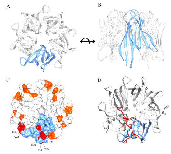 NPM1 N-terminal domain and interaction with arginine-rich motifs. NPM1 N-terminal domain (NTD) consists of eight antiparallel beta-strands forming a jellyroll barrel. Monomers associate to form a homopentamer, here represented from above (A) and in front view (B). (C) Arginine-rich motifs, often predicted to be the NoLS in protein partners, interact with residues of two adjacent monomers. Residues identified from the NMR analysis of the NPM1-p14ARF complex are highlighted in this surface representation. (D) Docking analysis of the interaction between NPM1 NTD and the NoLS peptide from Fbw7γ. The peptide adopts an extended conformation and engages two adjacent monomers.