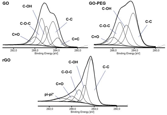 Three types of graphene-based nanofillers were analyzed by X-ray photoelectron spectroscopy (XPS) to study the chemical states and the presence of the functional groups. Figure 1 shows the high energy resolution spectra of the C1s region. The deconvoluted spectrum of GO showed five peaks of the following binding energies: 283.68, 284.60, 285.85, 286.71, and 287.98 eV, corresponding to five types of carbon components: C=C, C-C/C-H, carbon of C-OH, carbon of C-O-C and the carbon of C=O, respectively [26,27]. Decrease of the intensity of the peaks assigned to functional groups containing oxygen and the presence of the peak at 289.67 eV assigned to π-π* satellite bonds in rGO spectra, suggested partial reconstruction of a graphene structure. Additionally, changes in the C1s/O1s atomic ratio, calculated from the XPS spectra, confirmed the reduction in the number of oxygen-containing functional groups. For GO, the ratio was 0.95, while for rGO 1.79. The grafting of graphene oxide surface with poly(ethylene glycol) was carried out to improve the dispersion of GO in a polymer matrix and the adhesion between the nanofiller and the chitosan. The C1s/O1s atomic ratio remained the same as for GO (0.95), but the peak intensity from C-O-C binding, which builds the PEG structure, increased.