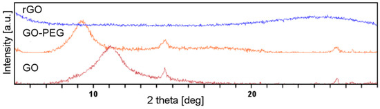 Another tool commonly used to investigate the graphene structure is X-ray diffractometry (XRD). The Bragg’s law allows the calculation of the d-spacing between the graphene sheets. The oxygen-containing functional groups increase the d-spacing in graphene. Additionally, their hydrophilic character facilitates absorption of water molecules, and thus further increases the d-spacing. Figure 2 shows the XRD pattern of GO, rGO and GO-PEG. The sharp diffraction peaks observed at 11.06° (d-spacing: 0.80 nm) correspond to the plane of hexagonal crystalline structure of GO. After reduction, a new, wide peak showed up at 24.54°, corresponding to the inter layer distance of 0.36 nm, a value very similar to d-spacing in graphene. In the case of GO-PEG, the peak shifted towards a smaller deflection angle as compared to GO (9.26° vs. 11.06°). Grafting of the GO surface with PEG resulted in an even greater increase of the distance between graphene sheets than in GO (0.95 nm). Hence, interactions between layers were weakened.