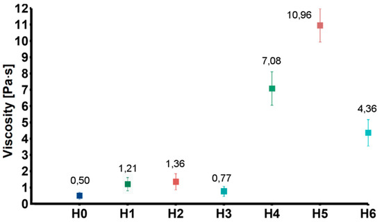 Viscosity of the tested solution (H0: chitosan (CS)) and dispersions (H1: CS/graphene oxide (GO); H2: CS/poly(ethylene glycol) grafted graphene oxide (GO-PEG); H3: CS/reduced graphene oxide (rGO); H4: CS/GO/hydroxyapatite (HAp); H5: CS/GO-PEG/HAp; H6: CS/rGO/HAp).