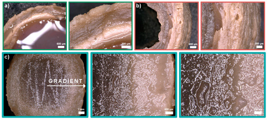 Cross-linking of the samples was optimized with different solutions and gelling times: (i) 5% TPP (sodium tripolyphosphate), 2 h + 10% NaOH, 10 min; (ii) 5% TPP, 4 h + 10% NaOH, 10 min, (iii) 0.5% TPP with 5% NaCl, 24 h. Morphology of the obtained samples varied significantly (Figure 4). When 5% TPP and 10% NaOH solutions were used, a multilayer hydrogel structure was observed (Figure 4a,b). Nie and others explained this phenomenon by the process of creating Liesegang rings [29]. Unfortunately, the samples melted before forming a strong outer layer causing the hydrogel to lose its shape. Additionally, without using a second bath in 10% NaOH, the samples deformed completely after removal from the 5% TPP solution. The use of NaCl increased ionic strength of the cross-linking solution. As a result, the diffusion of Cl- ions into the interior of the hydrogel allowed the cross-linking time to be extended. Gradually the Cl- ions were replaced by TPP and the hydrogel with a gradient structure was formed (Figure 4c).