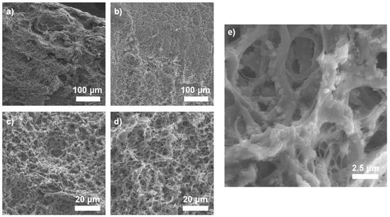 Representative SEM images of gradient hydrogels after freeze-drying (sample H5: chitosan/poly(ethylene glycol) grafted graphene oxide (GO-PEG)): (a) Edge of the sample, (b) Gradient inside, (c) Outer part, (d) Inner part, (e) Surface with visible hydroxyapatite (HAp) particles.