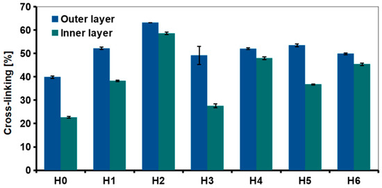 The degree of cross-linking of the outer and inner layers was examined using ninhydrin assay (Figure 6). The test was also carried out to evaluate the effect of the nanofillers and HAp addition. Interactions between the chitosan amino groups with graphene-based materials and hydroxyapatite should result in a higher degree of cross-linking as compared to H0. A significant difference in the degree of chitosan cross-linking between the center of the sample and the outer layer was measured in each hydrogel. For the reference sample, the degree of cross-linking of the outer layer was about 40% and the inner layer about 22%.