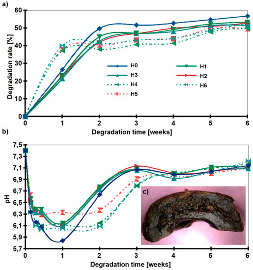 A cross-linking gradient was obtained to control the degradation of the hydrogel. The positive effect of the nanofillers addition on the stability of the hydrogels in PBS media was observed during the incubation test. Figure 7a shows the weight loss of the samples. In the first step, the degradation was rapid. During the first two weeks of incubation, most of the lactic acid was removed from the samples and the pH dropped from 7.4 to about 6 (Figure 7b). In the next step, the pH of the medium returned to neutral value and the pattern plateaued. Interestingly, for H1–H3 samples the weight loss after the first week of degradation was ≈20%, while for H4–H6 (hydrogels with HAp) ≈35%. However, after six weeks of degradation, the weight loss of all composite samples (H1–H6) was ≈50% and 57% for H0. All samples began to degrade from the inside and empty space was created (Figure 7c).