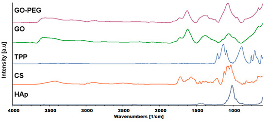 FTIR (Fourier transform infrared spectroscopy) spectra of the hydrogels components: HAp—hydroxyapatite, CS—chitosan, TPP—sodium tripolyphosphate, GO—graphene oxide, GO-PEG poly(ethylene glycol) grafted graphene oxide).