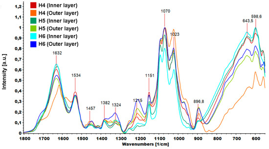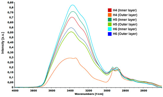 An interesting relationship was noticed in the area assigned to vibrations from hydroxyl groups (Figure 10). Spectra were normalized according to the highest peak. In each case, the –OH peak measured for the inner layer of the hydrogel had a higher intensity than the peak measured for the outer layer. Higher peak intensity was due to the higher water content inside the hydrogels and weaker cross-linking.