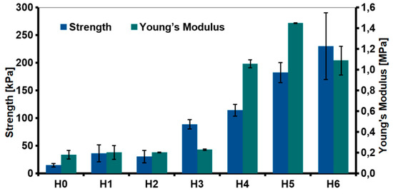 Mechanical properties (compressive strength and Young’s modulus) of the hydrogels (H0: chitosan (CS); H1: CS/graphene oxide (GO); H2: CS/poly(ethylene glycol) grafted graphene oxide (GO-PEG); H3: CS/reduced graphene oxide (rGO); H4: CS/GO/hydroxyapatite (HAp); H5: CS/GO-PEG/HAp; H6: CS/rGO/HAp).