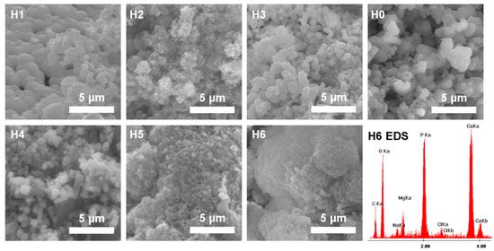 SEM (scanning electron microscopy) images of the hydrogels surface (H0: chitosan (CS); H1: CS/graphene oxide (GO); H2: CS/poly(ethylene glycol) grafted graphene oxide (GO-PEG); H3: CS/reduced graphene oxide (rGO); H4: CS/GO/hydroxyapatite (HAp); H5: CS/GO-PEG/HAp; H6: CS/rGO/HAp) after 4 weeks of incubation in simulated body fluid (SBF) solution and representative energy dispersive spectroscopy (EDS) spectrum (for H6).