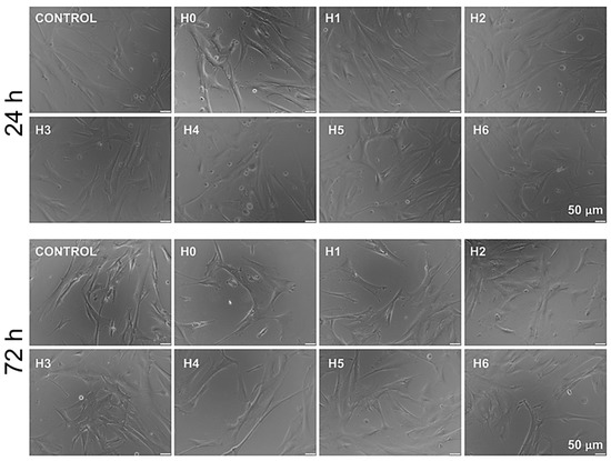 Representative images of morphology of hUC-MSCs (human umbilical cord Wharton’s jelly mesenchymal stem cells) cultured for 24 and 72 h in a particular liquid extract of chitosan-based samples (H0: chitosan (CS); H1: CS/graphene oxide (GO); H2: CS/poly(ethylene glycol) grafted graphene oxide (GO-PEG); H3: CS/reduced graphene oxide (rGO); H4: CS/GO/hydroxyapatite (HAp); H5: CS/GO-PEG/HAp; H6: CS/rGO/HAp). Scale bar: 50µm.