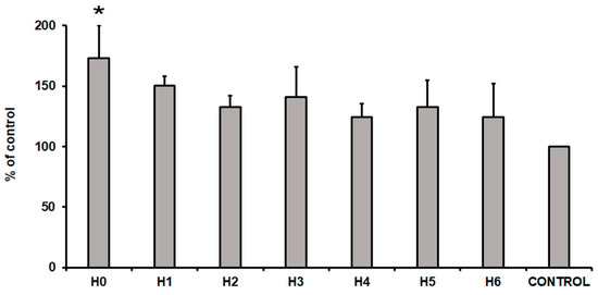 The cytotoxicity of liquid extracts of chitosan-based samples (H0: chitosan (CS); H1: CS/graphene oxide (GO); H2: CS/poly(ethylene glycol) grafted graphene oxide (GO-PEG); H3: CS/reduced graphene oxide (rGO); H4: CS/GO/hydroxyapatite (HAp); H5: CS/GO-PEG/HAp; H6: CS/rGO/HAp) towards hUC-MSCs (human umbilical cord Wharton’s jelly mesenchymal stem cells) after 24 h of the cell culture. Data are expressed as mean ± SD. P value less than 0.05 (p < 0.05) was considered as statistically significant and labeled by an asterisk (*).