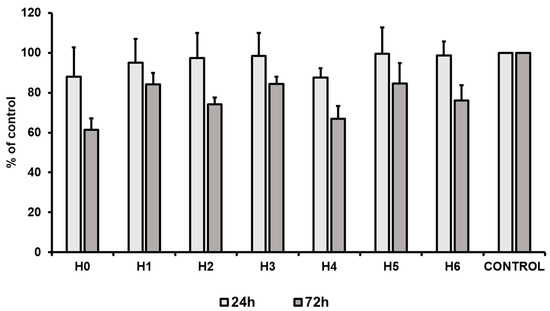 Proliferation of hUC-MSCs (human umbilical cord Wharton’s jelly mesenchymal stem cells) after 24 and 72 h of the cell culture in liquid extracts of chitosan-based samples (H0: chitosan (CS); H1: CS/graphene oxide (GO); H2: CS/poly(ethylene glycol) grafted graphene oxide (GO-PEG); H3: CS/reduced graphene oxide (rGO); H4: CS/GO/hydroxyapatite (HAp); H5: CS/GO-PEG/HAp; H6: CS/rGO/HAp). Data are presented as mean ± SD.