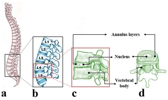 Schematic presentation of (a) the human spine and (b) lumbar region of the human spine consisting of five intervertebral discs (IVDs). (c,d) Represent a functional spinal unit including IVD and adjacent vertebral bodies from the lumbar spine displayed from the side and top views, respectively. The vertebral body, nucleus, and annulus layers in an isolated IVD were identified using black arrows. The lumbar spine and a functional spinal unit (side view) under two magnifications were denoted by black and red rectangles, respectively.