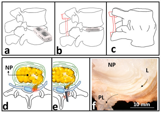 (a–c) Schematic drawing for spinal fusion to treat degeneration-induced-low back pain (LBP) including (a) remove the degenerated intervertebral disc (IVD) (b) insertion of spin polyetheretherketone (PEEK) cage and (c) restrain the adjacent vertebrae for bone formation. The schematic drawings in red (b,c) denoting an internal fixator used in spinal fusion surgery. (d,e) Schematic drawing of discectomy to treat herniation-induced-LBP including (d) a herniated IVD and (e) the percutaneous endoscopic discectomy process to alleviate LBP by removing the herniated nucleus polposus (NP). (f) A camera photo captured from a herniated IVD to identify herniation pathway initiating from the lateral region (L) moving towards the posterolateral region (PL) of the AF donated by black arrows. (Panel f was reproduced with permission from [18]).