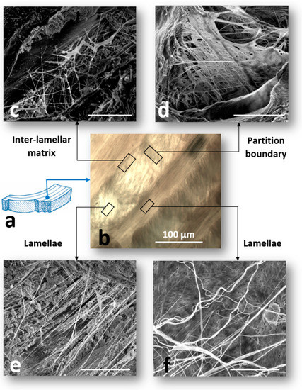(a) Schematic drawing of the annulus fibrosus (AF) lamellar structure. (b) A light microscopic image of the AF prepared at a transverse cutting plane. (c–e) Scanning electron microscopy (SEM) images of the structural organization of elastic fibers in different regions of the annulus fibrosus (AF) including (c) inter-lamellar region (ILM), (d) partition boundary (PB), and (e,f) adjacent lamellae. The regions of interest including ILM, PB, and adjacent lamellae in the AF were denoted by black rectangles and the scale bars for the SEM images were 5 μm. (Panels (c,e), panel (d) and panel (f) were reproduced with permission from [34], [30], and [31], respectively).
