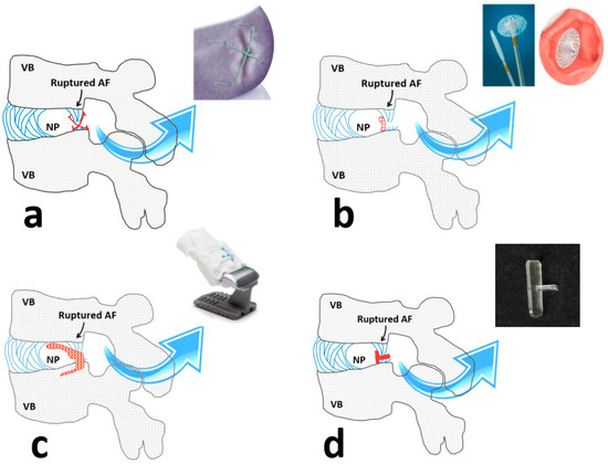 (a–c) The schematic drawings and images of three different commercial approaches to repair the annulus fibrosus (AF) including (a) Xclose®, (b) Inclose®, and (c) Barricaid®. (d) A schematic drawing representing a shape memory polymeric implant that was prepared at the laboratory level to repair the AF. The rupture site at the AF and implant images were denoted by black and blue arrows, respectively. The schematic drawings of the implants were denoted in red sketches for each panel. VB, NP, and AF were abbreviations for the vertebral body, nucleus pulposus, and the annulus fibrosus, respectively. (Panels (c,d images) were reproduced with permission from [53] and [55], respectively).