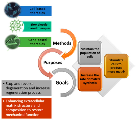 Degeneration of the IVD is a complex condition with multifactorial etiology involving age, genetics, and biology. Additionally, structural defects and damages to the AF manifested by mechanical loads are likely to result in IVD herniation and accelerating degeneration. In a degenerated IVD, the AF is less organized and dehydrated with lower proteoglycans exhibiting different mechanical properties compared to the healthy tissues. A decrease in the AF cell density, as frequently observed in degenerated IVDs, alters the balance of anabolism:catabolism ratio in the extracellular matrix (ECM), changing the AF mechanical, biological, and structural properties [69,70,71]. Therefore, regenerative strategies aim to repopulate a degenerated IVD with healthy cells (cell therapy) or stimulating the existing cells to regulate the ECM reaching an enhanced composition, quantity, and structure (biomolecule and gene therapy) [81,82,83,84,85]. ECM remodeling is crucial to control the action of biochemical mediators such as cytokines (interleukins), growth factors, and enzymes (metalloproteinases and heparanase) to ultimately stop or reverse the IVD degeneration process [86,87,88,89]. In the past few years, cell, biomolecule, and gene therapies have been central to the regenerative strategies (Figure 5).
