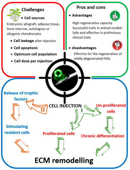 However, there are some limitations relevant to cell-based therapy to regenerate the AF [108]. The optimal cell source (bone marrow stem, mesenchymal stromal, and IVD cells) for clinical applications is yet to be defined [106,107]. Preclinical studies have revealed that cell therapy was unlikely to regenerate the AF in highly degenerated IVDs, due to the lack of structural integrity to physically maintain the cells after injection and an appropriate biological environment important to prevent cell apoptosis. Therefore, patients suffering moderate IVD degeneration may benefit most from this type of treatment [109,110,111]. Other restrictions relevant to the cell-based therapy is how to maintain cells at the injection site, preserve their ideal population, and determine the cell dose per injection.