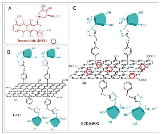 (A) Doxorubicin (DOX); (B) Schematic sketch of Graphene functionalized with Cationic Cyclodextrins (GCD platform); (C) Schematic sketch of DOX loaded on GCD (GCD@DOX).