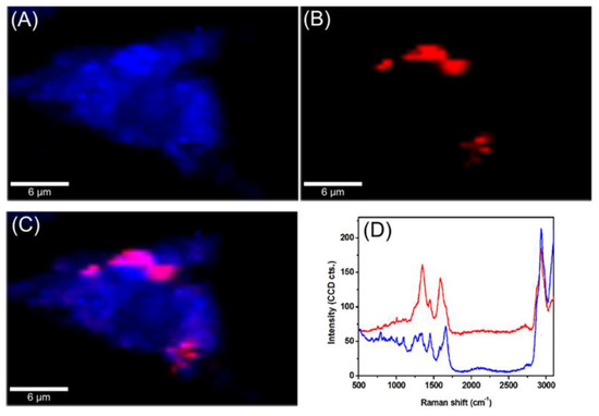 Raman maps of a single C26 colon carcinoma cells incubated for 24 h with GCD@DOX. (A) The map was obtained by plotting the intensity of C-H stretching vibrational bands of lipids at 2800–3100 cm−1 (B) The map was generated by plotting the intensity of the G band of graphene at 1584 cm−1. (C) Overlaid Raman maps presented in (A,B). (D) Extracted spectra corresponding to colored areas.