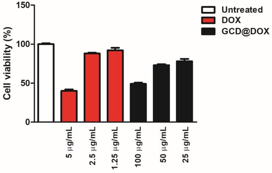Cytotoxicity of GCD in different cell lines was investigated in our previous study [16]. Specifically, in tumor HEp-2 cells a cellular proliferation percentage of 75, 80 and 100% was detected after their exposition to graphene at 100, 50 and 25 μg/mL, respectively [16]. To complete the investigations on the cytotoxic effect of the whole drug delivery system (GCD@DOX), additional experiments (Figure 6) were performed by using free DOX (5, 2.5 and 1.25 μg/mL) and untreated HEp-2 cells as positive and negative controls, respectively. The cells were treated for 24 h with GCD@DOX at the concentrations of 100, 50 and 25 μg/mL corresponding to nominal DOX concentration of 2.5, 1.25 and 0.625 μg/mL, respectively. The results graphically represented as percentage of cell viability (Figure 6) showed a decrease of 40% and 76% of cellular proliferation after exposition to 100 and 50 μg/mL of GCD@DOX (DOX loading corresponding to 2.5 and 1.25 μg/mL, respectively). These biological outcomes were comparable with the effects of free DOX at 5 and 2.5 μg/mL that showed 40% and 88% of cellular proliferation (Figure 6).