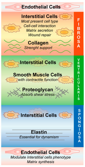 Aortic valve structure. Aortic valve is divided into three different layers: the fibrosa which faces the aorta, the spongiosa in the center and the ventricularis which faces left ventricular outflow tract. Valvular interstitial cells are the prevalent cell type and present in all layers. In addition, the tissue is characterized by a small percentage of smooth muscle cells and by valvular endothelial cells. All these cells are surrounded by extracellular matrix, including collagen, proteoglycan and elastin.